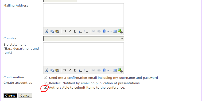 2. Fill in all the personal details and select Create account as “Author”. Then, click Create.